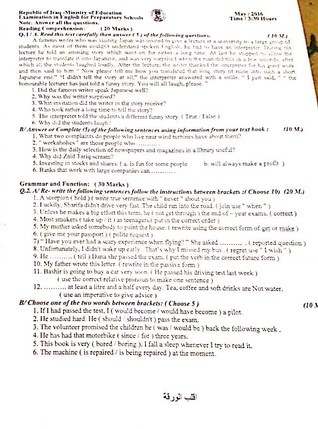 اسئلة امتحان مادة اللغة الانكليزية للصف السادس الاعدادي اليوم 30 5 2016 الدور الاول
