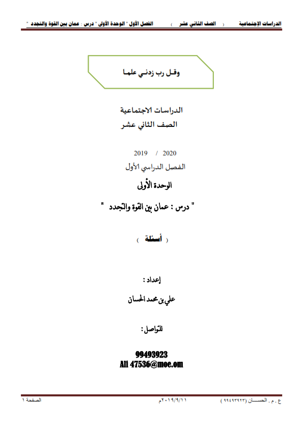 درس عمان بين القوة والتجدد في الدراسات الاجتماعية للصف الثاني عشر الفصل الاول اسئلة و اجوبة