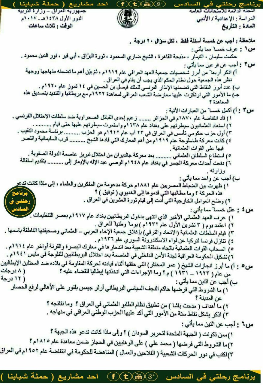 اجوبة وحلول اسئلة مادة التاريخ للصف السادس الادبي للعام 2017 الدور الاول