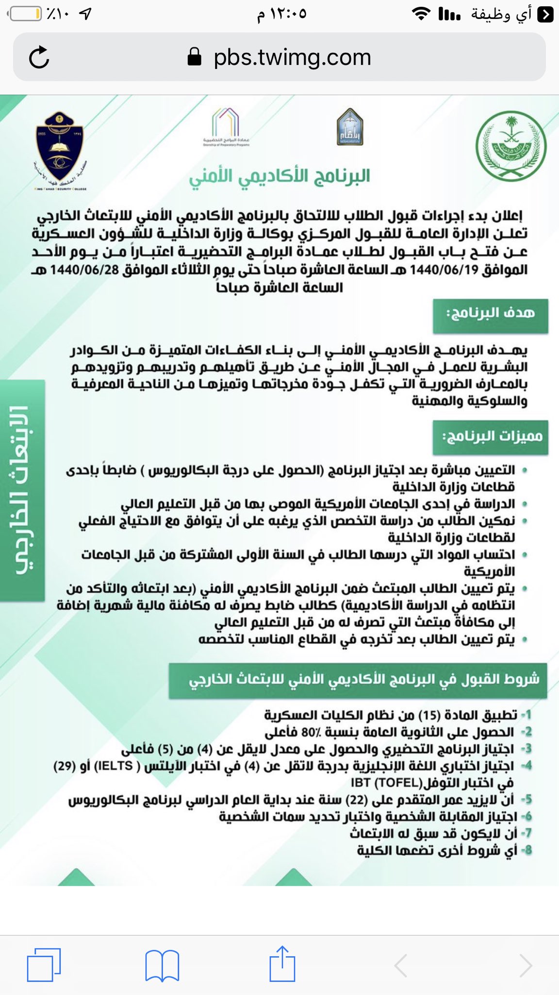وظايف عسكريه On Twitter ابتعاث داخلي وخارجي أعلنت الإدارة العامة للقبول بوزارة الداخلية بالتعاون مع كلية الملك فهد الأمنية موعد فتح التسجيل في برنامج الإبتعاث الداخلي والإبتعاث الخارجي لعام ١٤٤٠ه ٢٠١٩م لطلبة عمادة البرامج التحضيرية