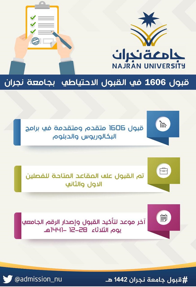 عمادة القبول والتسجيل On Twitter تذكير للمقبولين مبدئيا آخر موعد لتأكيد القبول وإصدار الرقم الجامعي هو نهاية يوم الخميس 2 12 1441هـ عبر خدمة نتائج القبول Https T Co Jp0foi756u قبول جامعه نجران 1442 جامعة نجران Https T Co B5zbbevl4s