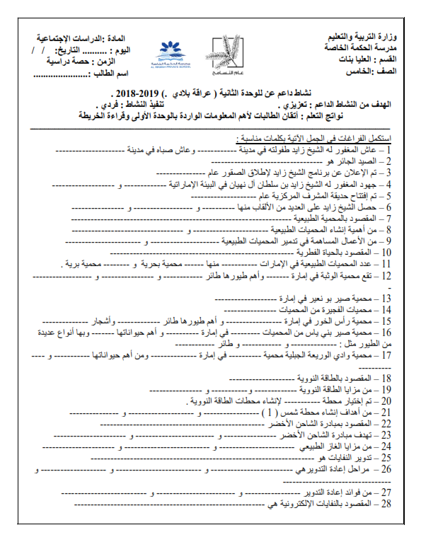 ورقة عمل في الدراسات الاجتماعية و التربية الوطنية عراقة بلادي للصف الخامس الفصل الثاني 2018 2019