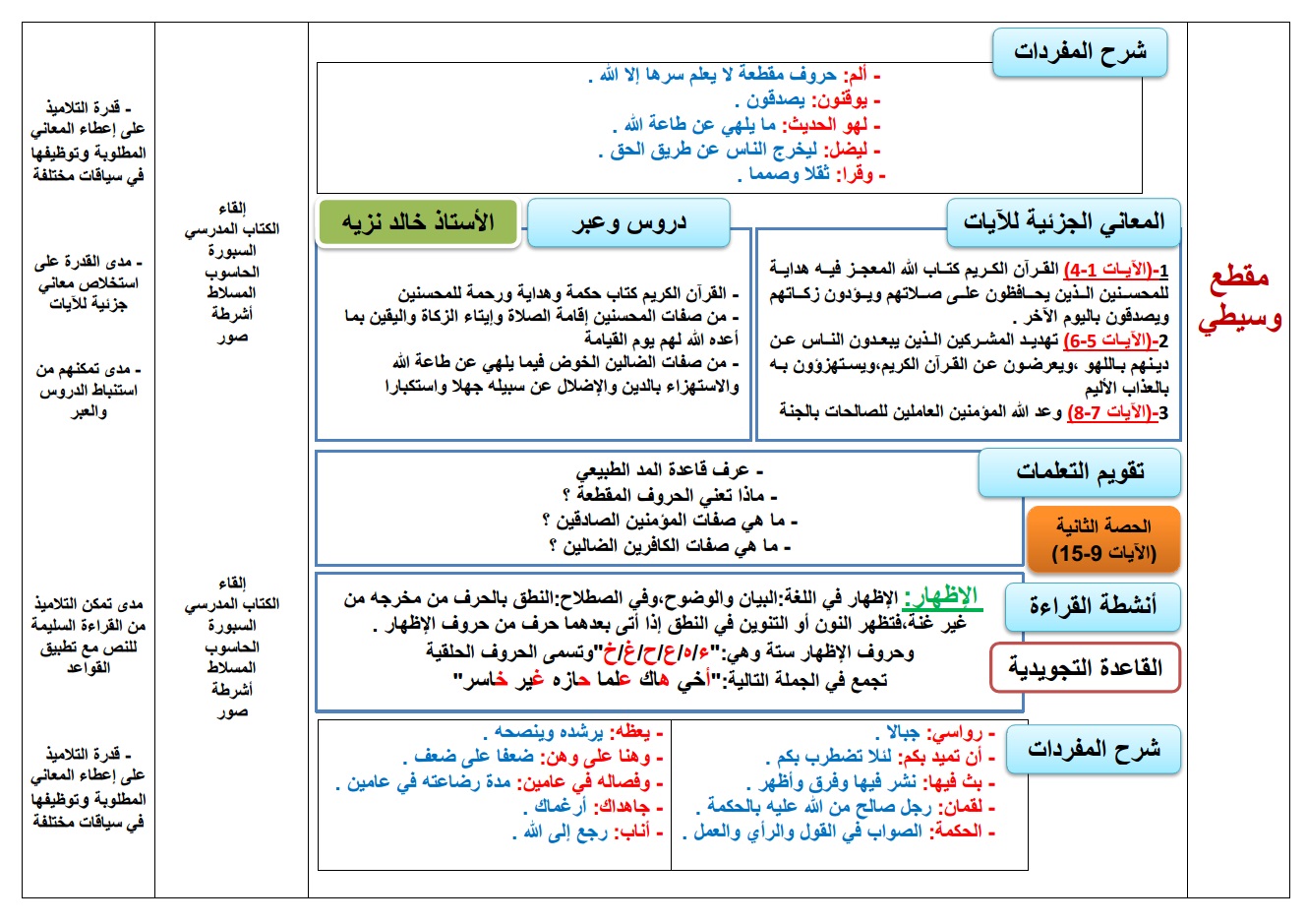 طريق الحسنى دروس التربية الإسلامية سورة لقمان الشطر الأول الأيات 1 15