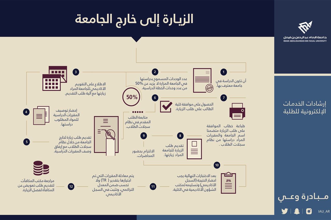 عمادة القبول والتسجيل Twitterren خطوات طلب الزيارة إلى خارج الجامعة لطلاب وطالبات جامعة الإمام عبدالرحمن بن فيصل إلى جامعة أخرى مبادرة وعي